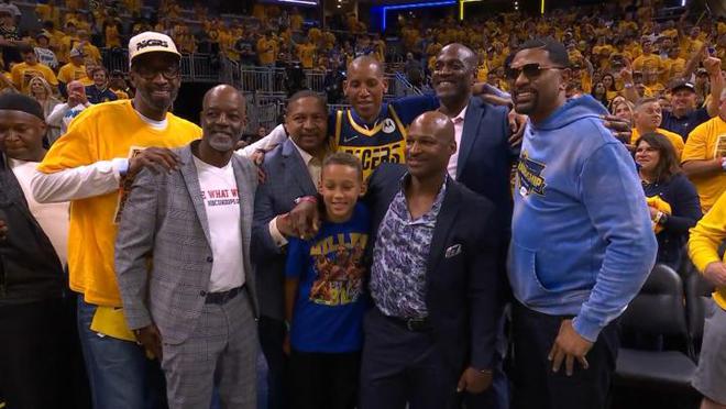 比赛第四节期间,场边的步行者名宿们来了一张大合照,当时他们满脸笑容,但最终主队遭遇末节逆转……